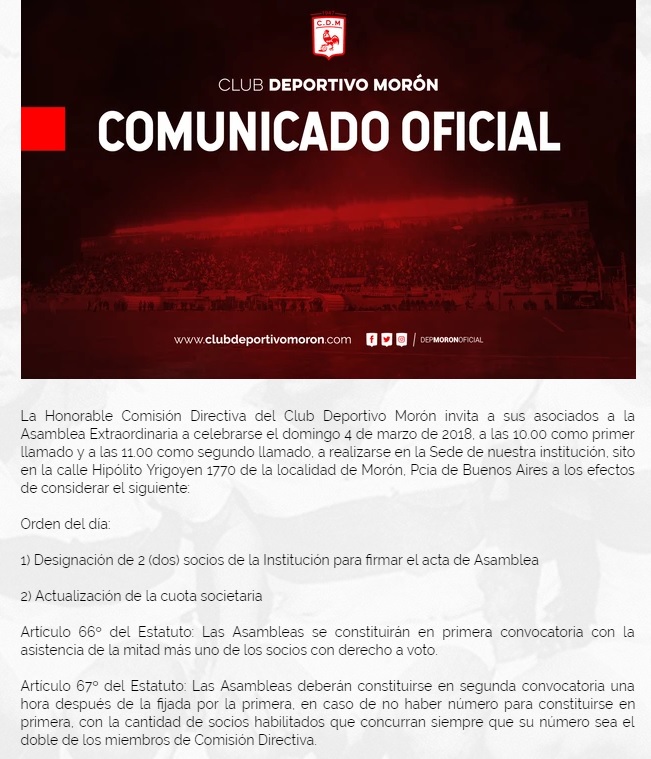 Finalmente se confirmó la fecha de la próxima Asamblea Extraordinaria en el Club Deportivo Morón y será el próximo domingo 4 de marzo por la mañana en la Sede del Club. En un comunicado oficial, desde la Comisión Directiva hicieron saber que en la misma se tratará el aumento de la cuota social que hoy es de $200 para la popular y parte desde los $50 para menores de 3 a 5 años.