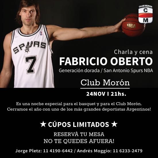 Como cierre de las actividades del programa de básquet “Queremos jugar”, el Club Morón realizará una cena íntima en el buffet del club junto con Fabricio Oberto, ex jugador de la Selección Argentina de Básquet (Oro en Atenas 2004 y Bronce en Beijing 2008) y NBA (campeón con San Antonio Spurs en la temporada 2006/7).